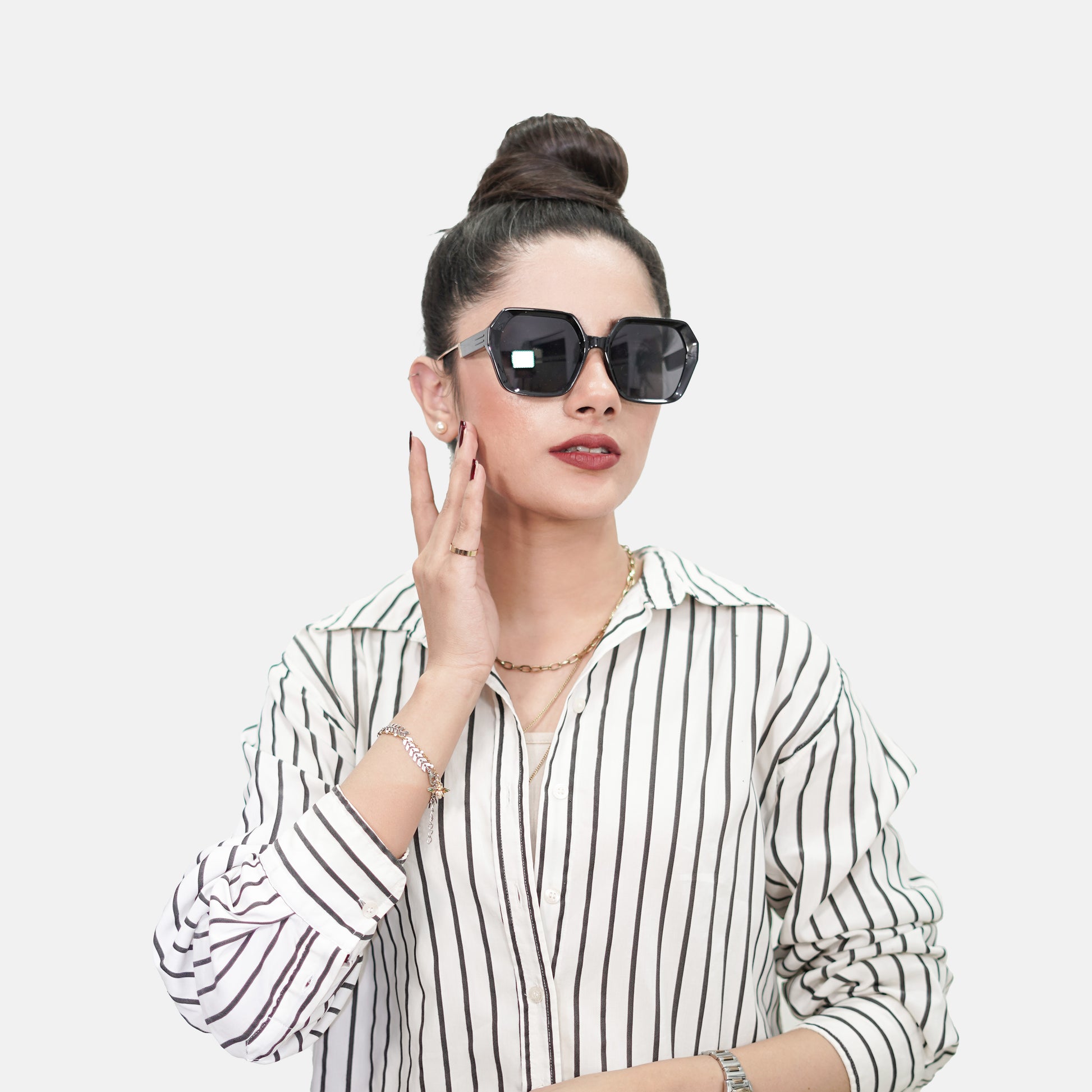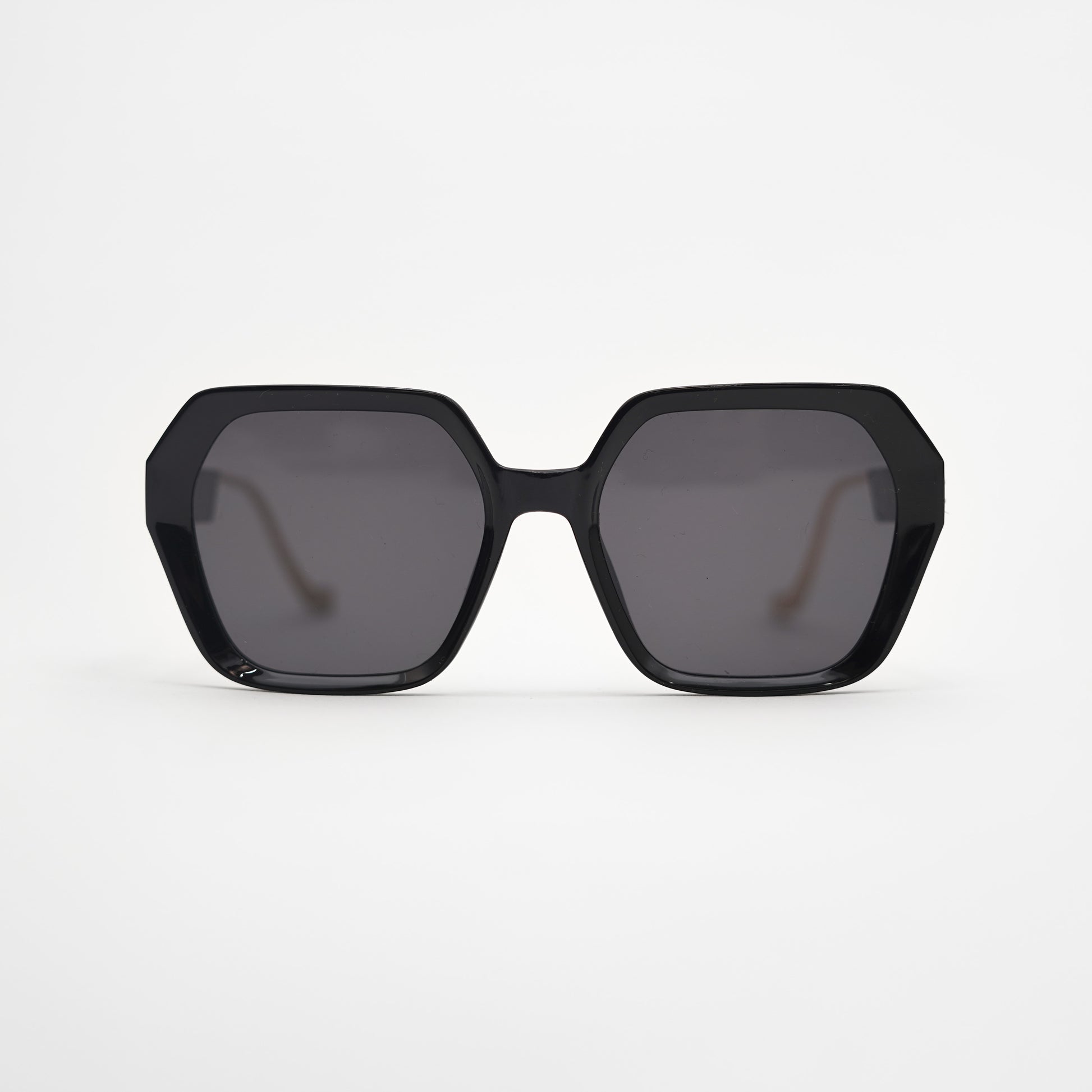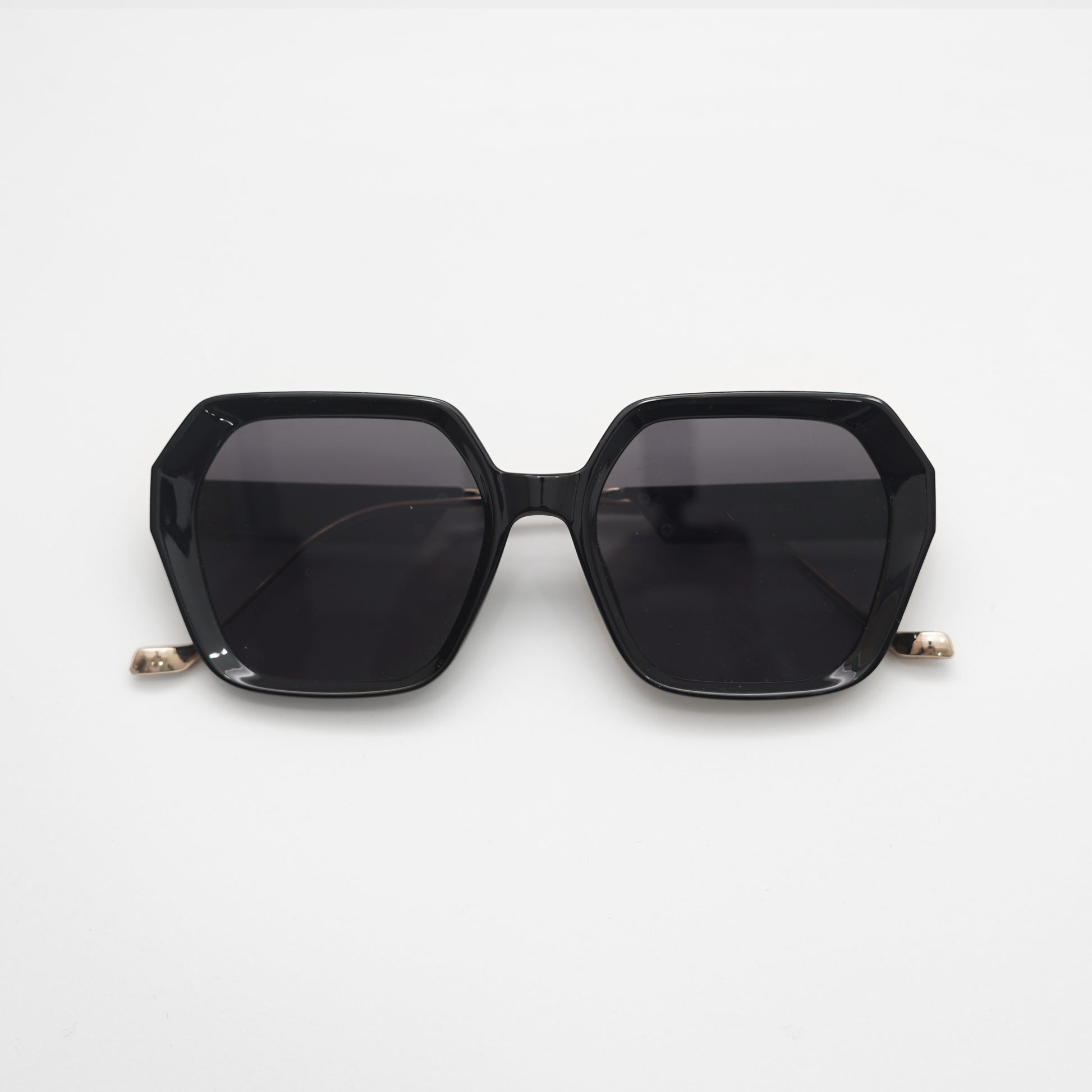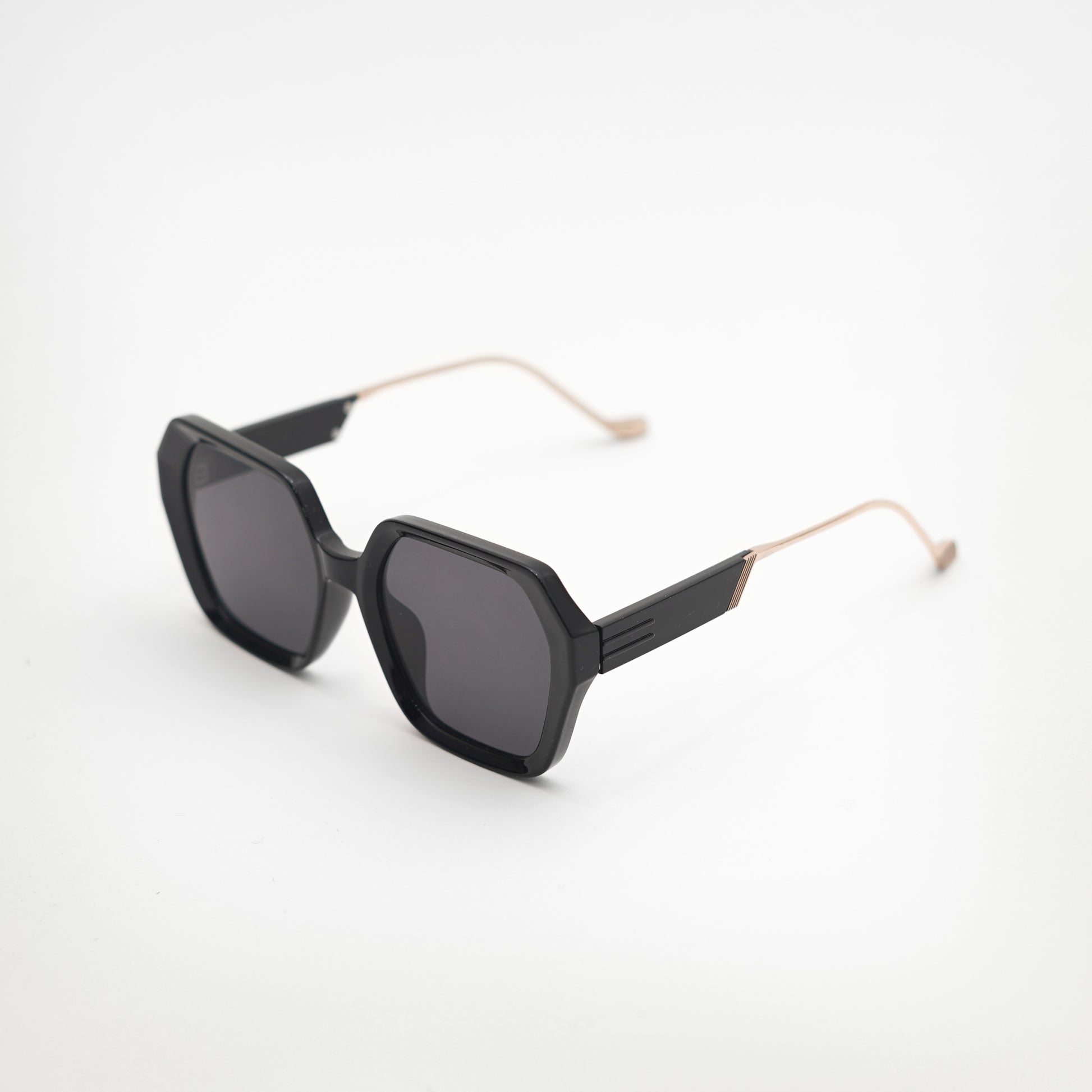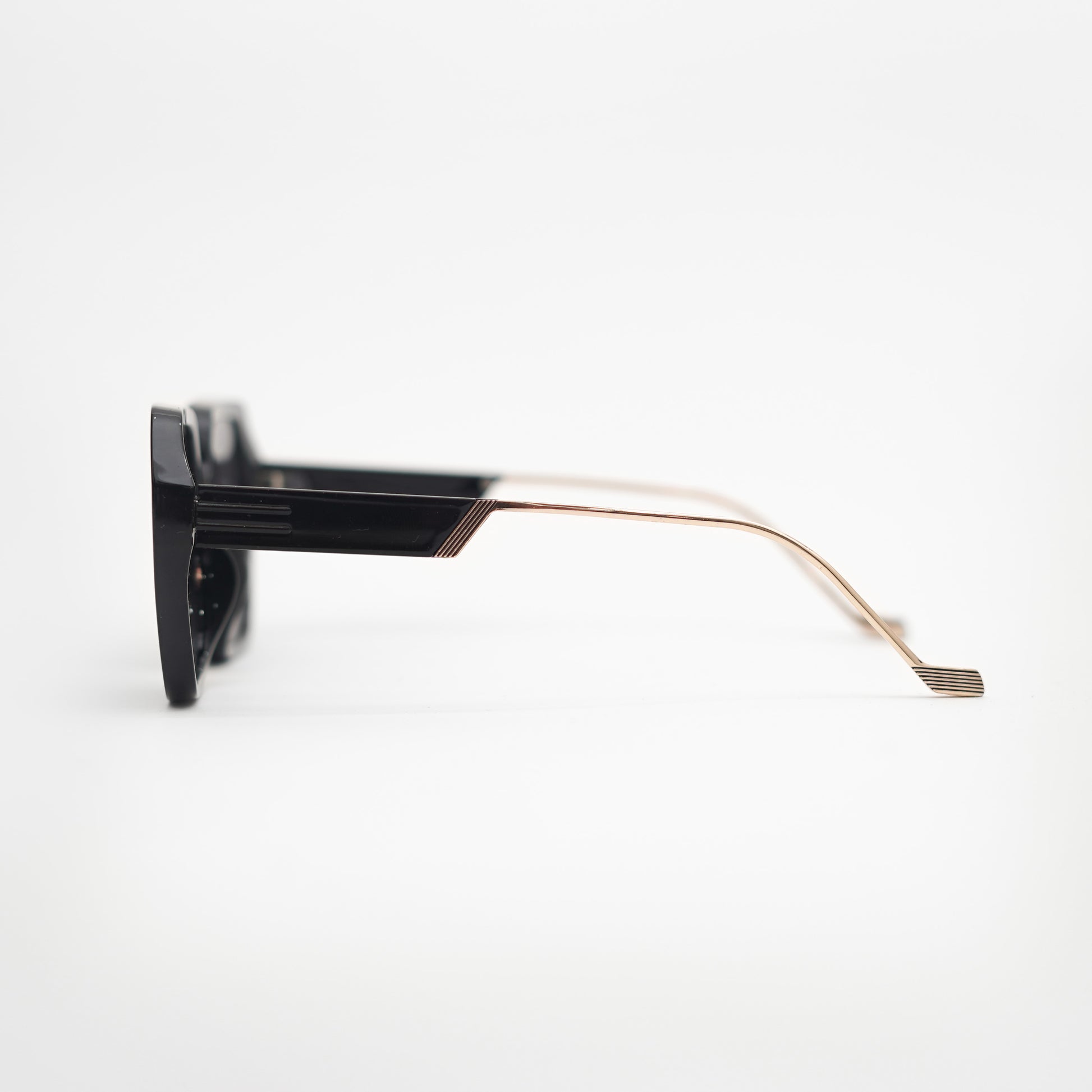 Black bold Oversized geometrical shaped frame with black glasses and golden ear sides.