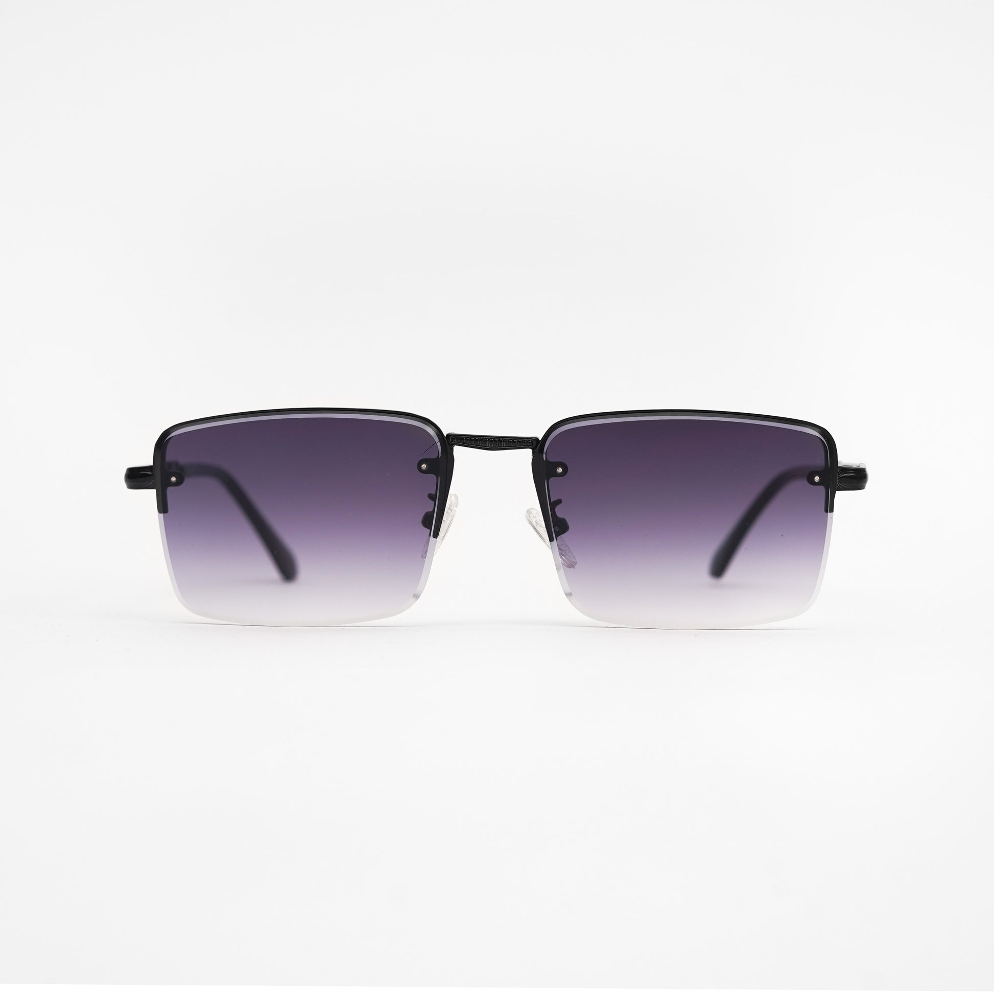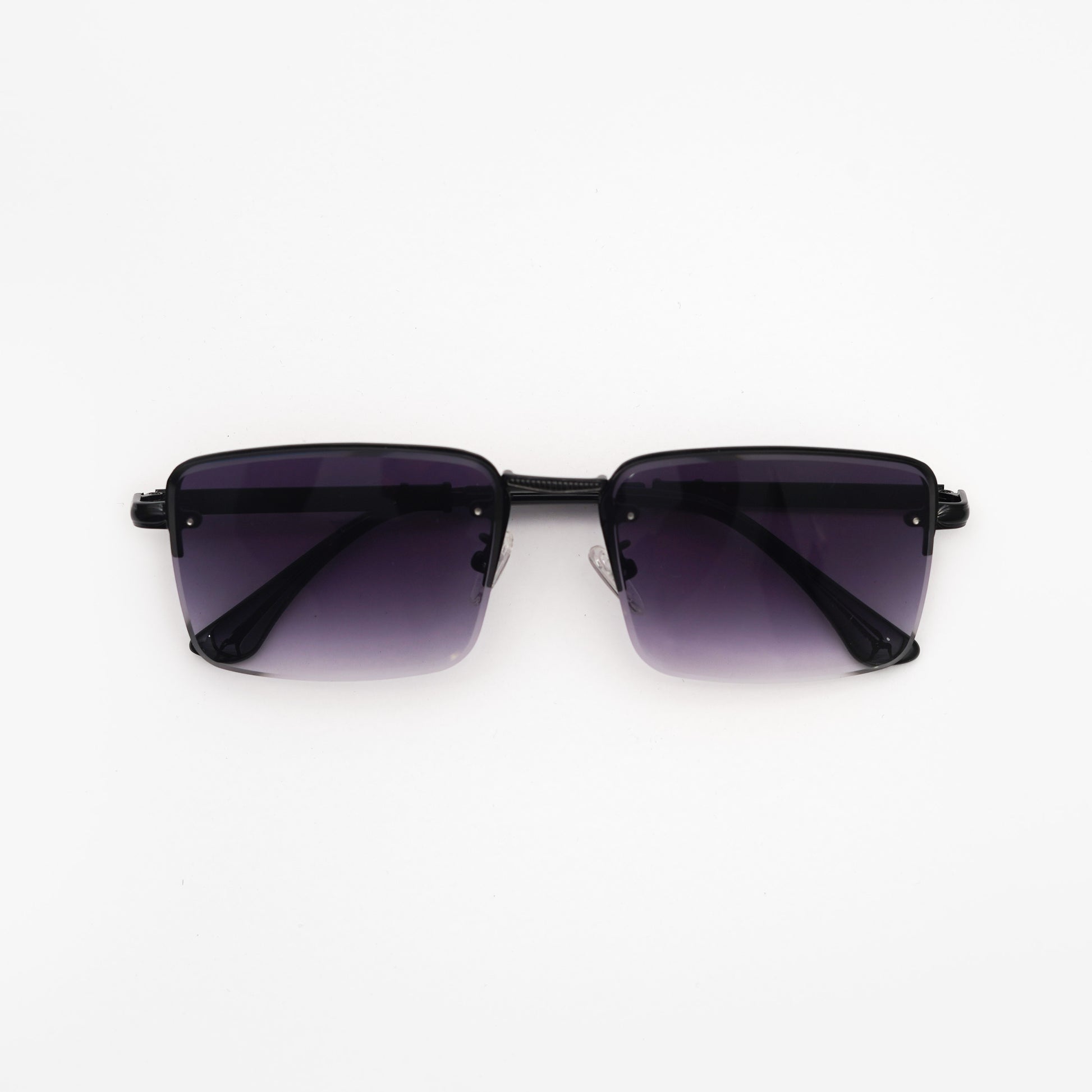 Rimless sunglasses feature a sleek rectangular design with a minimalist black frame and matching black-shaded lenses.